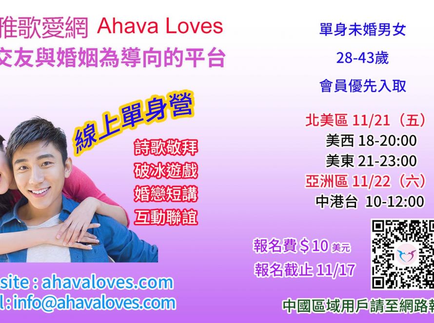 線上單身營:北美 11/21 (五); 亞洲 11/22 (六)