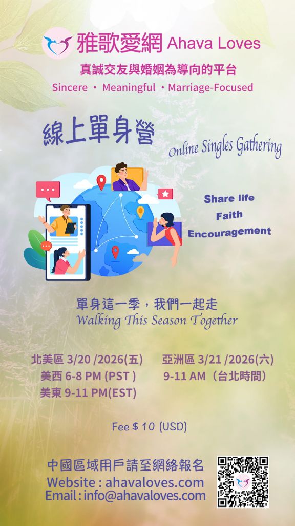 線上單身營: 北美 3/20 (五); 亞洲 3/21 (六)