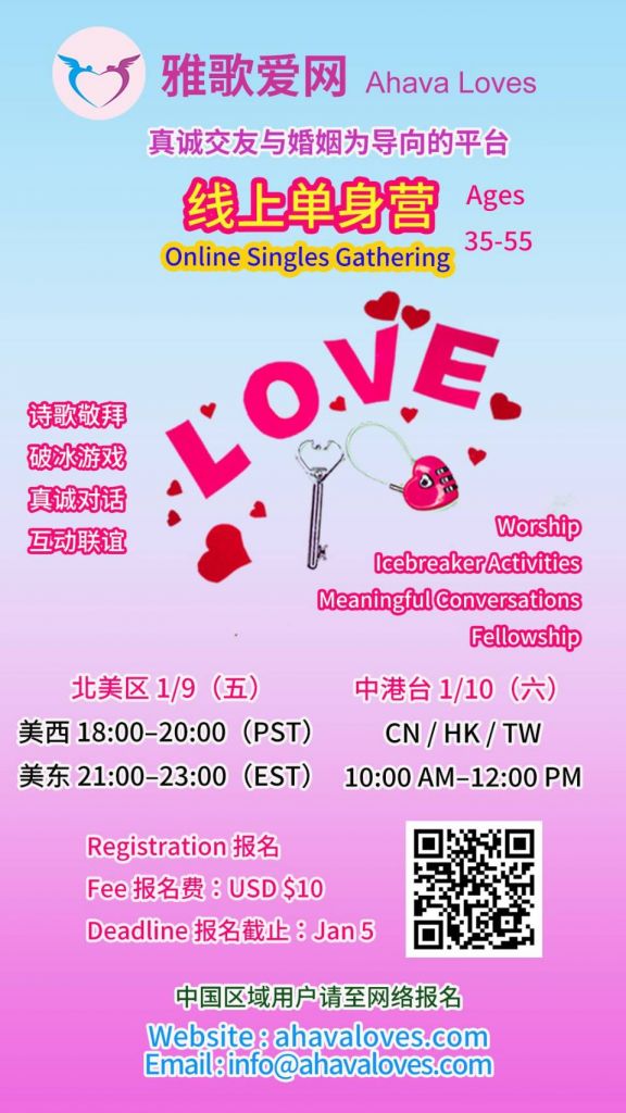 线上单身营:北美 01/09 (五); 亚洲 01/10 (六)