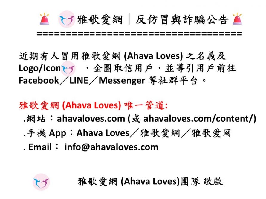 使用說明 雅歌愛網介紹September 21, 2025ByAhava LovesRead more 配對系統流程September 22, 2025ByAhava LovesRead more 常見問題解答 (FAQs)September 22, 2025ByAhava LovesRead more APP 升級說明會回放October 15, 2025BySimon ChangRead more 溫馨提醒: 熟識前,請勿交換個人聯絡方式March 1, 2026BySimon ChangRead more 雅歌愛網: – 反仿冒/詐騙5 days agoBySimon ChangRead more